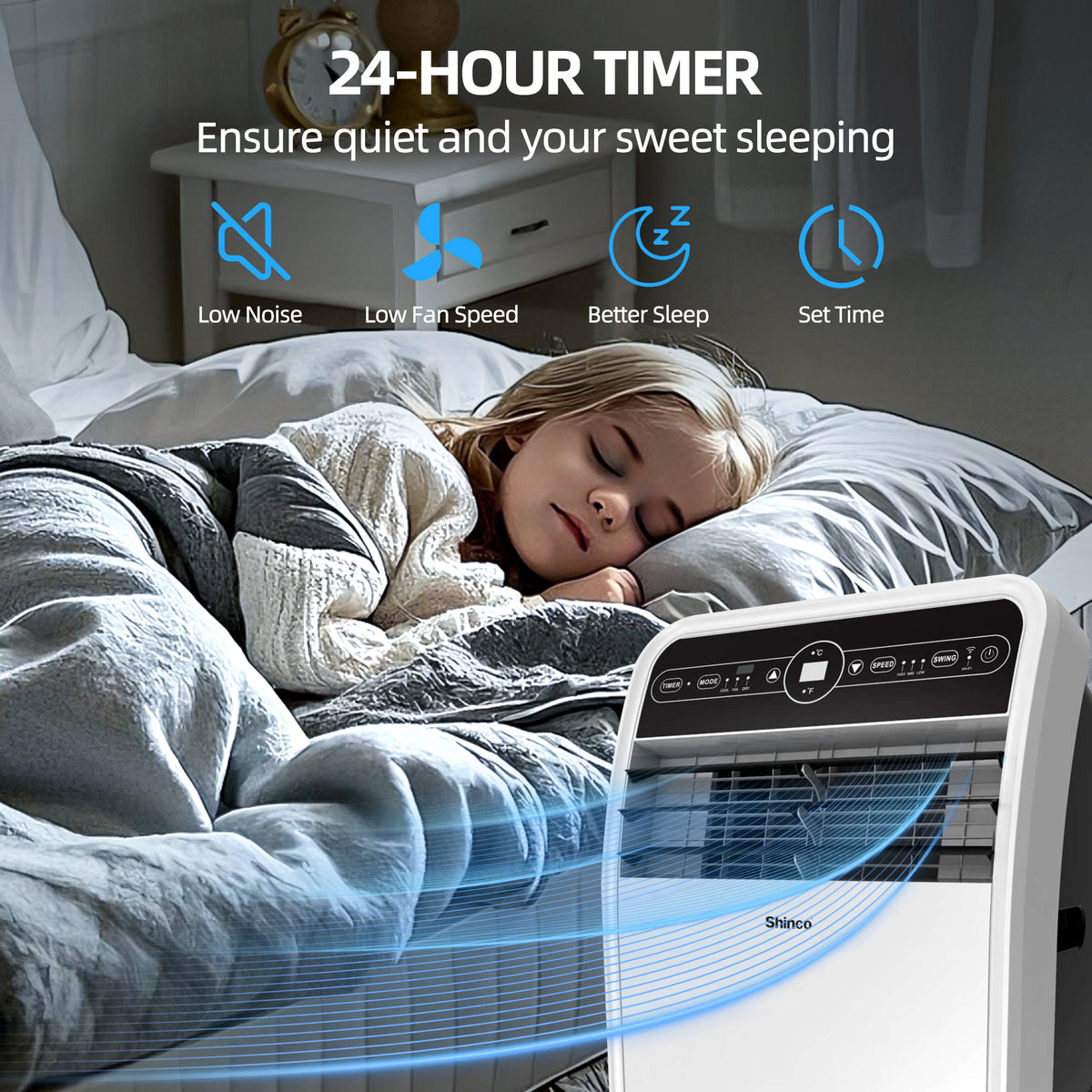 - Sleep Mode & Smart Timer: Drift off peacefully with quiet operation (52dB) and auto-adjusting temps (raises 1.8°F every 2 hours). The 24-hour timer lets you schedule cooling in advance, wake up or come home with perfect comfort!