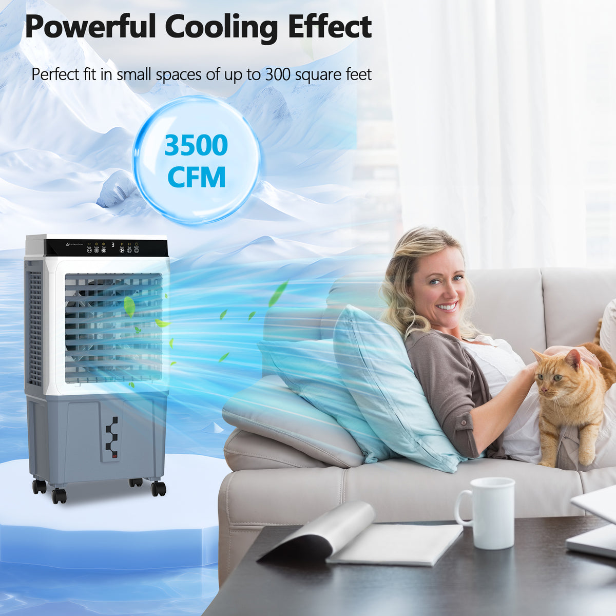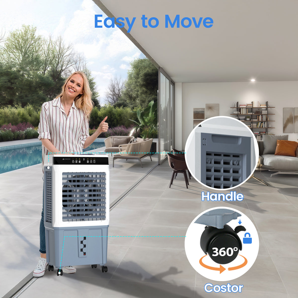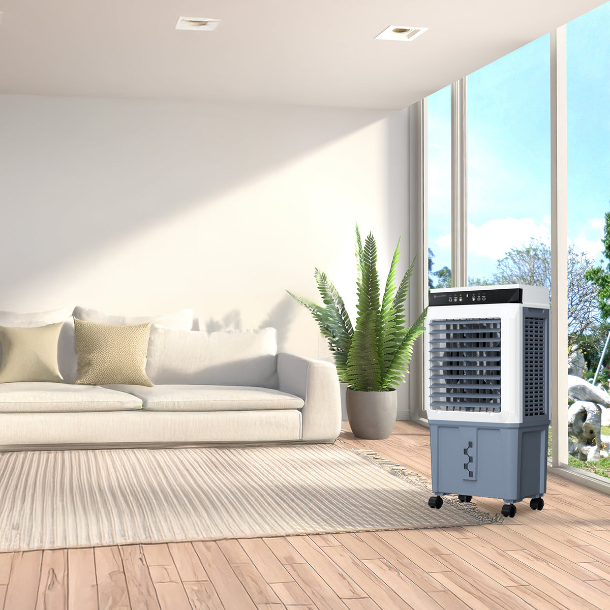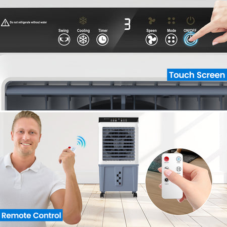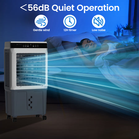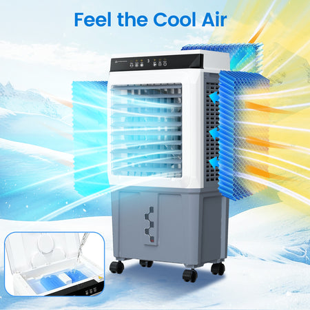 Beat the summer heat with this high-performance Portable Evaporative cooler.Unlike traditional AC units, this Evaporative Air Cooler Fan uses the natural process of water evaporation to cool the air, offering a more energy-efficient and eco-friendly solution.With a powerful 120W motor, it can effectively lower temperatures in spaces up to 300 sq. ft..Its smooth-rolling wheels with rear locking design, you can easily move the unit anywhere and secure it in place for safe, stable operation making it perfect for garages, patios, workshops, or living rooms.Easy to use, powerful, and portable-this is the Portable Evaporative Cooler you've been waiting for.