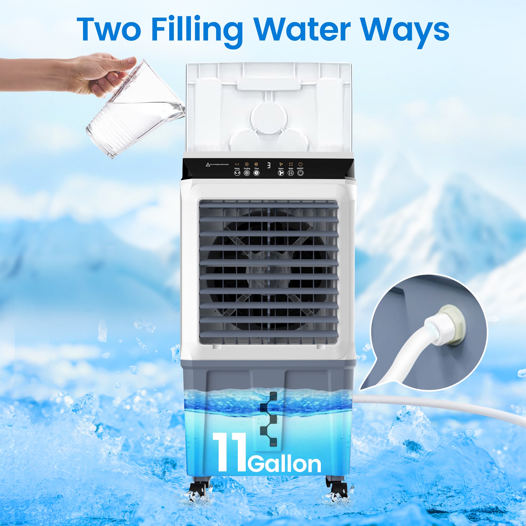 - Large 11-gallon water tank supports 8+ hours of uninterrupted cooling.