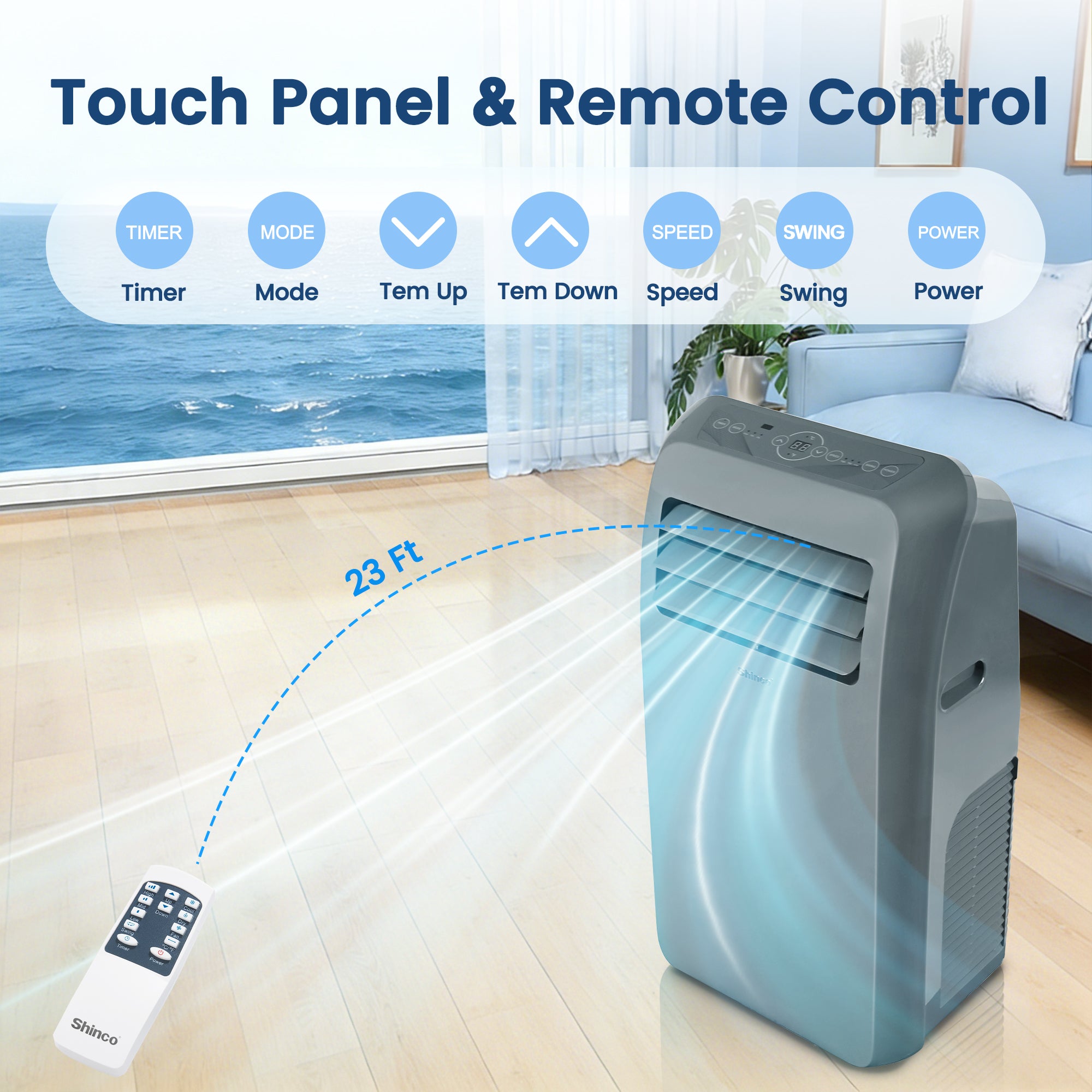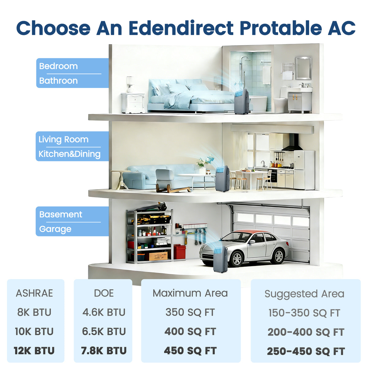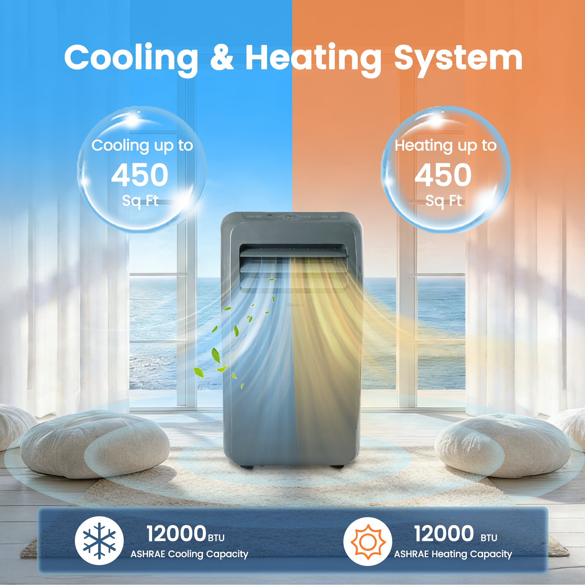 Introducing the year-round climate solution from EdenDirect-Shinco. This powerful 4-in-1 portable unit combines a 12,000 BTU (ASHRAE) / 7,800 BTU (DOE) air conditioner with a robust 12,000 BTU heater, a high-capacity dehumidifier, and a fan-all in one sleek, mobile package. Designed to efficiently cool and heat spaces up to 450 square feet, it offers ultimate versatility for any season. With simple plug-in operation, a complete window installation kit, and digital remote control, it delivers convenient, whole-room comfort for your home, office, or business.