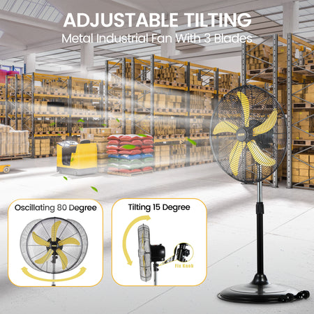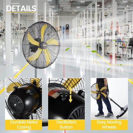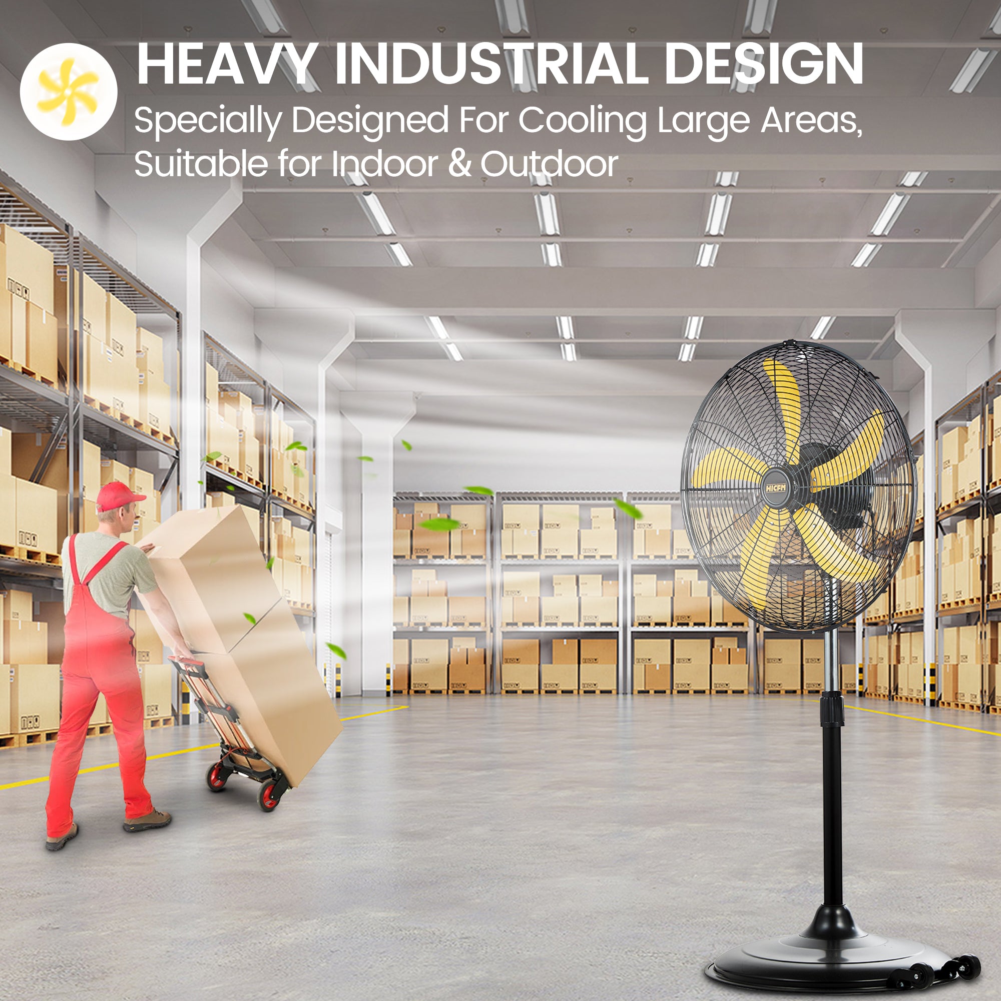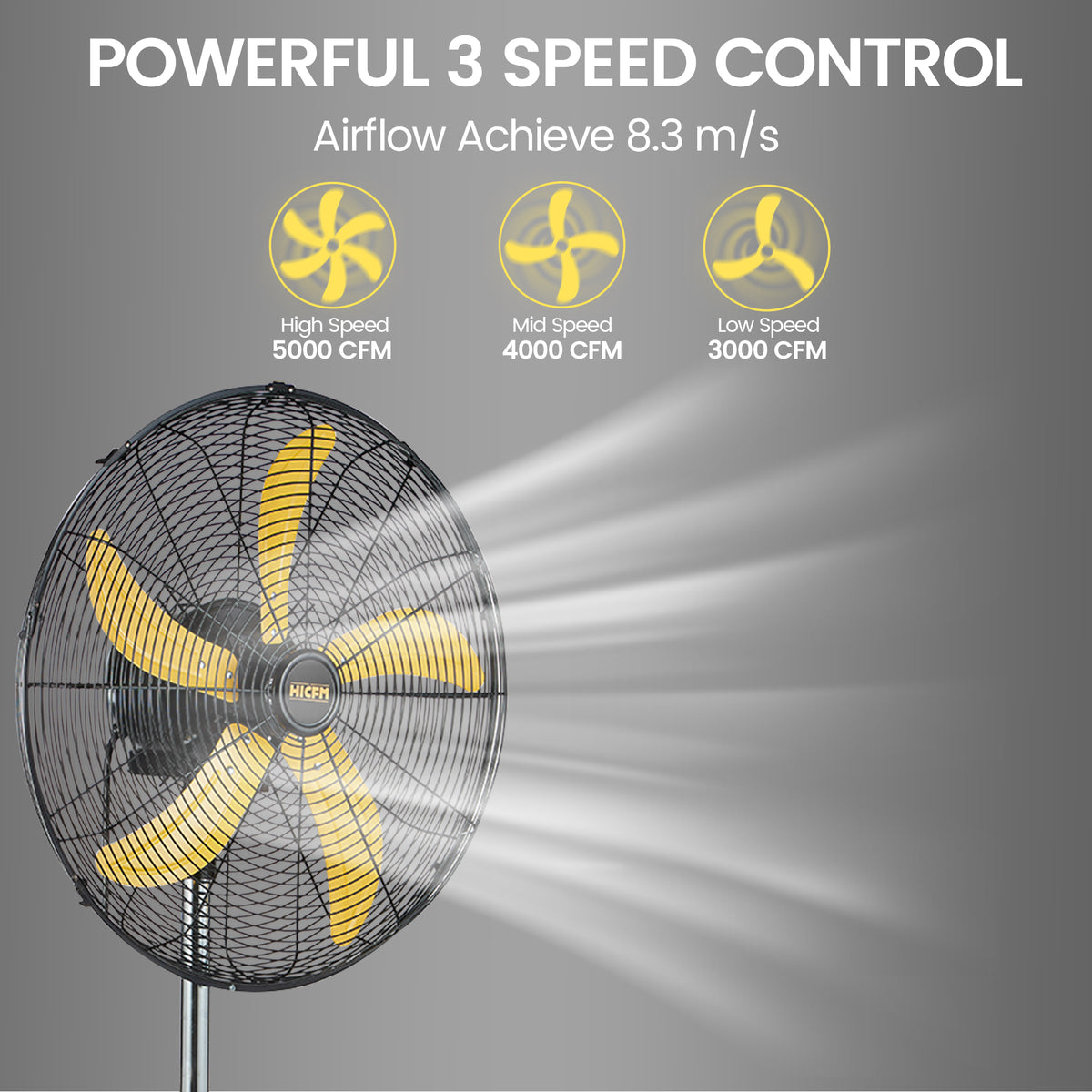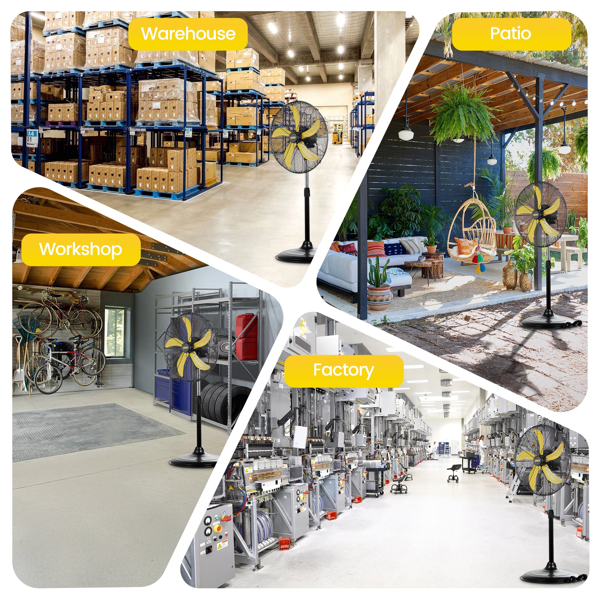 Built with 1/5HP powerful motor and turbo aluminum blades, this heavy duty pedestal fan provides refreshing breeze for large spaces. High speed 5000 CFM / Medium speed 4000 CFM / Low speed 3000 CFM. It is ideal for Warehouse, Workshop, Factory, Garage, Basement, Industrial, Commercial and Covered Patio.