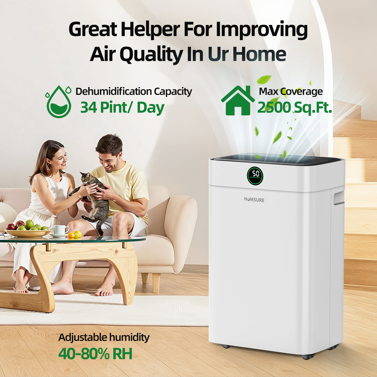 34 pt. 2,500 sq. ft. Dehumidifier in White with Drain Hose and Bucket, Auto Defrost, Low Noise, Dehumidify Efficiently