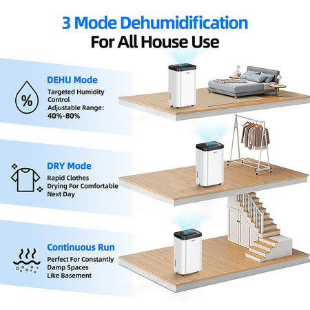 - 【Totally 5 Mode Dehumidy & Negative Ion Function】for this dehumidifier for home and basement, there are totally 5 different mode for different using appliance, such as, adjustable humidistat (from 40%-80%), continuous run-DRYING mode, RAINING mode: automatic setting.RH=45%; SLEEP Mode: automatic setting.RH=50%. Its unique negative ion feature helps reduce airborne dust particles, enhancing your overall air quality for easier breathing.