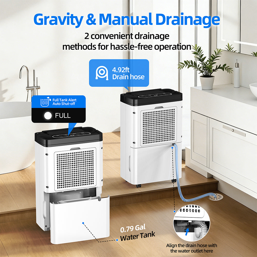 - 【Flexible Water Removal】This dehumidifier offers two convenient drainage options to suit your needs: Water Tank: It comes with a 6.3 PT water tank that can be easily emptied as needed. Continuous Drainage: For hassle-free operation, you can connect a drainage hose (included with a length of 3.3 feet) for continuous water removal, ensuring you never have to worry about emptying the tank manually.
