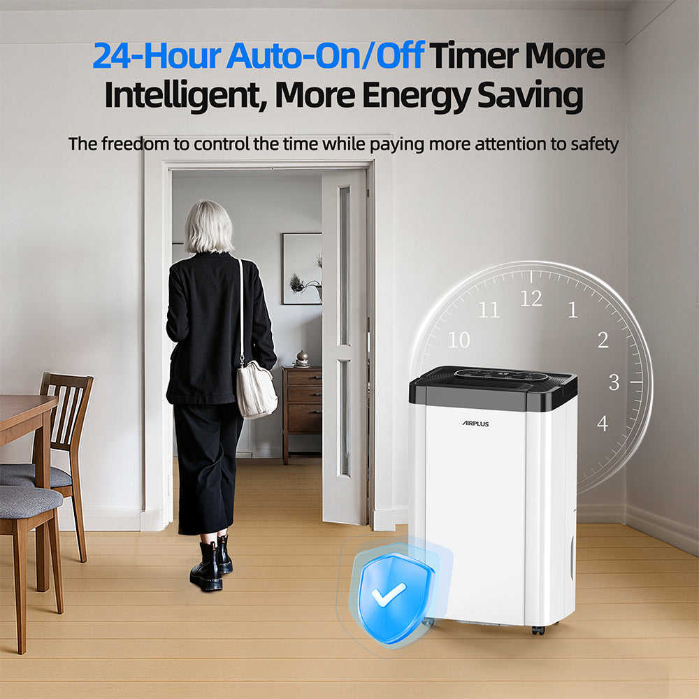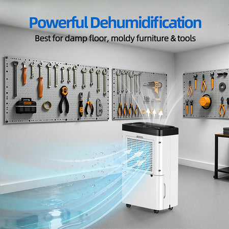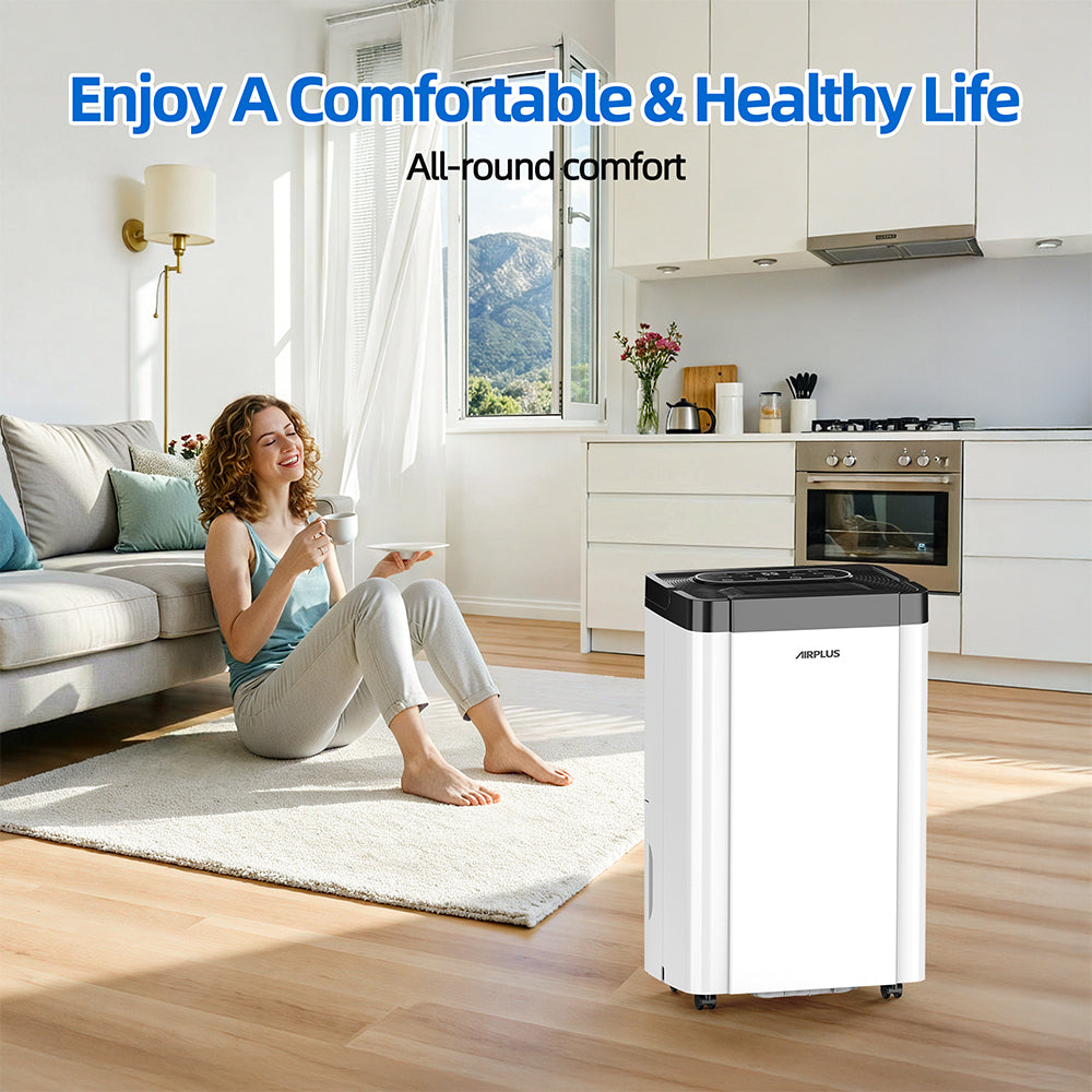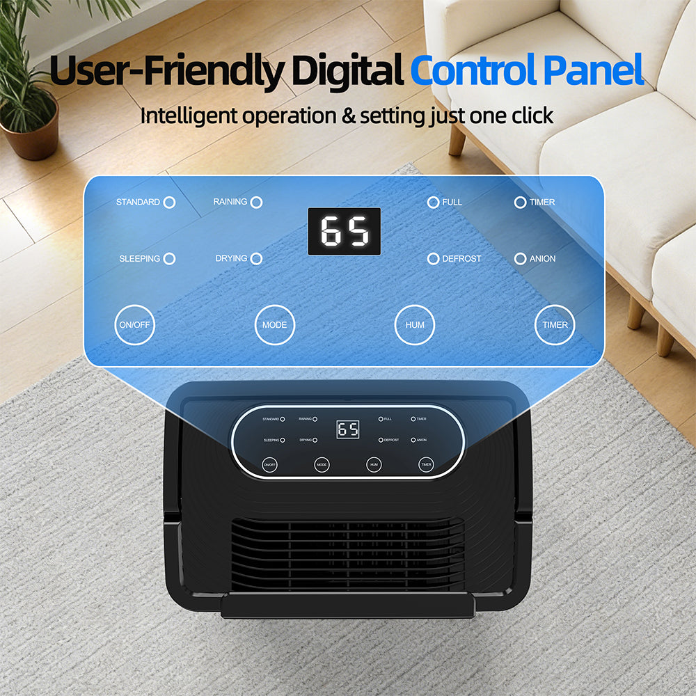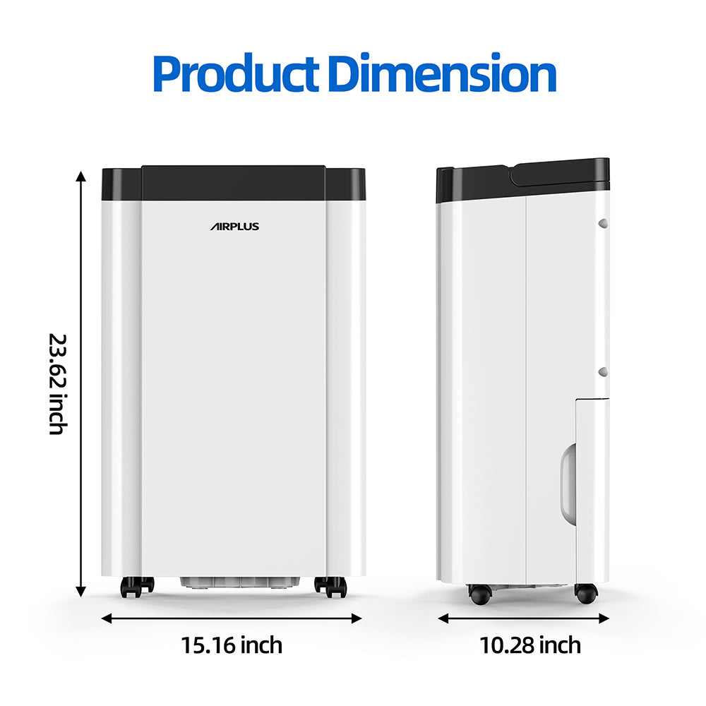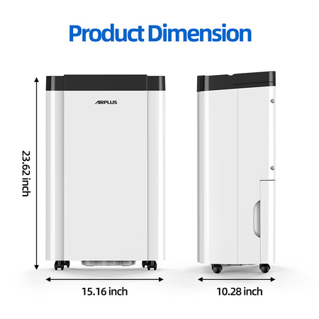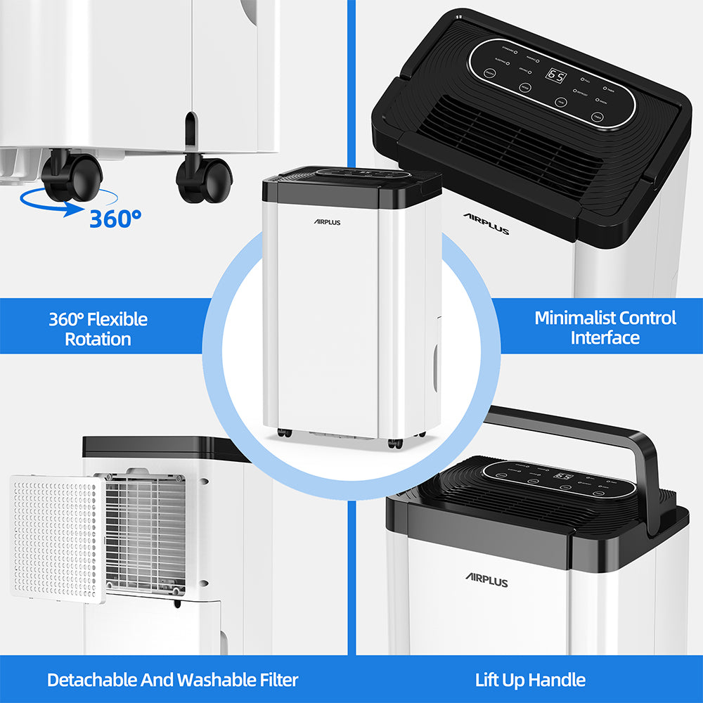 - 【Stylish, Sleek and Compact Design】This dehumidifier features a sleek design with a white body with classical black top for display clear and intelligent control panel and air outlet, while the water level window on the back allows you to check the water level at a glance. This dehumidifier for home comes with lift-up handle and smooth 4 casters, you could move it to any room you need.