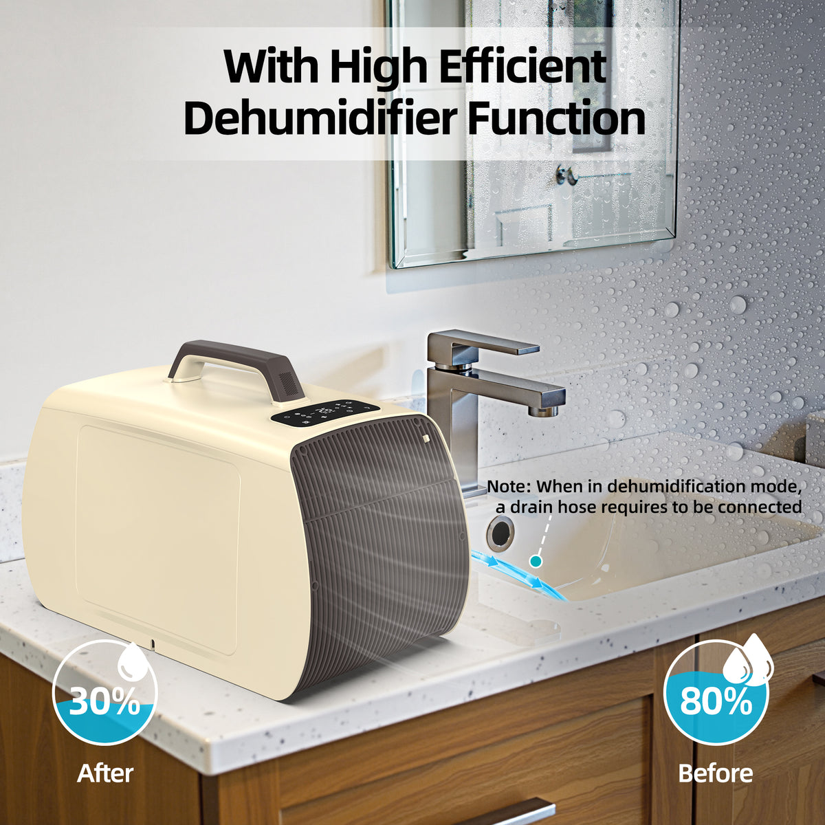 - Convenient drainage: this portable air conditioner adopts a high-temperature self-evaporation system and a built-in water tank, by default, no drainage is required when it is turned on, depending on humidity, you can also connect the water hose that came with the unit to drain the water to a collector/bottle or directly to the ground
