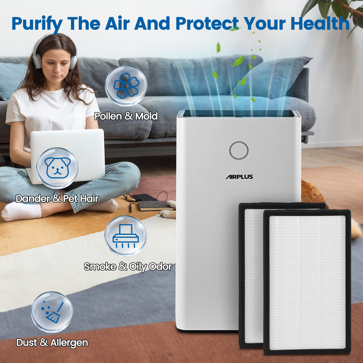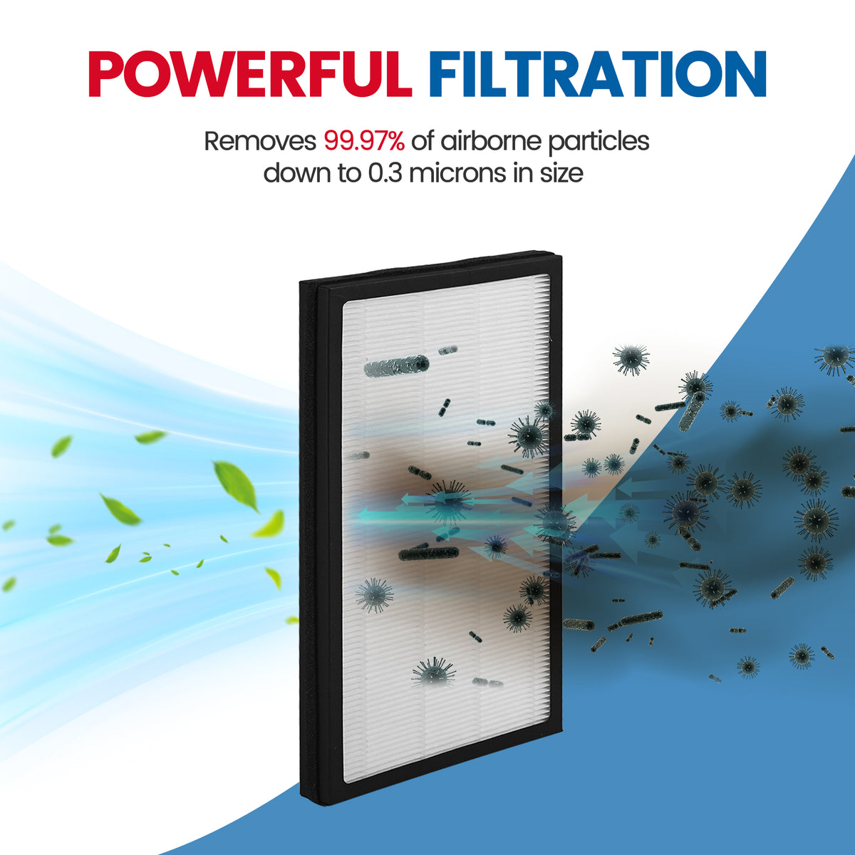 - 3-layer filter design, remove and capture 99.99% of all airborne particles down to 0.01 microns, preventing pollen, dust, pet skin chips, wildfire smoke, odors, and harmful substances formaldehyde, true HEPA filtration